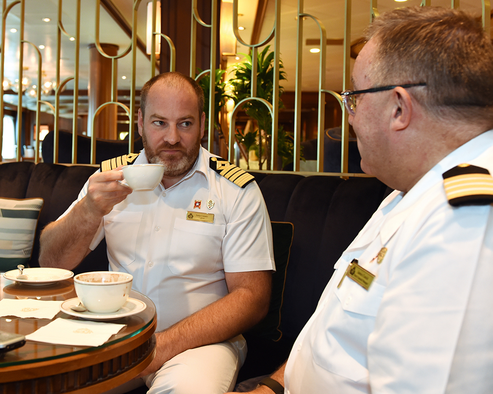 Inzwischen ist Tomás Connery neben Andrew James Hall einer der beiden Kapitäne auf der Queen Victoria – und liebt sowohl das Schiff selbst als auch die Routen. „Ich mag diesen Art-déco-Stil, natürlich den Afternoon-Tea und den herausragenden White Star Service.“ Die Begrüßung der Gäste durch die Bell Boys, die kleinen Aufmerksamkeiten der Crew, die persönliche Ansprache –all dies mache „seine“ Queen Victoria zu etwas ganz Besonderem. Der Kapitän schätzt auch den engen Austausch mit Hotel General Manager James Cusick sehr. Es hat schon gute Tradition, dass die beiden Landsmänner sich auf einen Kaffee im Commodore Club oder im Chart Room zur „Lagebesprechung“ treffen.