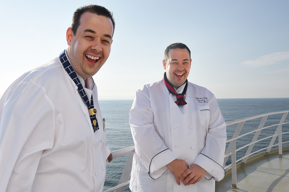 Klein sind die beiden 40-Jährigen zwar wahrlich nicht, und einigermaßen stillsitzen können sie auch, wenn es denn sein muss. Doch das Funkeln in ihren Augen, das schelmische Lachen, die Verwendung von Ausdrücken wie „amazing“, „breathtaking“, „exciting“ und „fabulous“ – all dies verrät, dass Nicholas und Mark Oldroyd sich, wie damals auf Weihnachten, heute einfach unbändig auf die Umsetzung ihres Genusskonzepts an Bord der Queen Mary 2 freuen. Nicholas ist der Hausherr im kulinarischen Reich an Bord der Königin. Seinen 17 Minuten jüngeren Bruder Mark sieht er normalerweise bei Weitem nicht mehr so oft wie früher, als die beiden quasi Hand in Hand die ersten Schritte ihrer beeindruckenden Karriere gingen, in der französischen Sterneküche Erfahrungen sammelten und zunächst ab 1999 Seite an Seite auf der damaligen Queen Elizabeth 2 kochten. Das ist längst Vergangenheit: Mark ist inzwischen Küchenchef auf der neuen Queen Elizabeth. Umso glücklicher ist Nicholas, ihn zum Umbau der Restaurantbereiche und zur Einführung komplett neuer Menüpläne an seiner Seite zu wissen: „Es ist eine enorme Erleichterung, meinen Bruder jetzt hier zu haben; der Job wird dadurch um ein Vielfaches einfacher.“