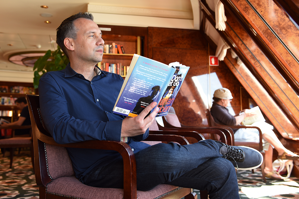 Bei der anschließenden Autogrammstunde wird er von einer Leserin skeptisch gefragt: „Ihre Frau sagt Ihnen aber nicht etwa, Du wirst von Buch zu Buch merkwürdiger‘, oder?“ Alle lachen, am meisten Fitzek. Es scheint also auch anderen rätselhaft, wie dieser nette Junge zu Titeln wie Der Seelenbrecher, Amokspiel oder Die Blutschule kommt. Dass er trotzdem die Herzen seiner Leser und vor allem Leserinnen gewinnt, ist glasklar. Eine andere Leserin hat „erst“ drei Thriller gelesen, ist aber begeistert. Sie lässt sich eine Widmung ins Buch schreiben, für Mirko. Fitzek will wissen, wer das sei. „Ein Freund der Familie“, sagt die Dame. „Ah – kein Feind der Familie!“ Fitzek grinst, wieder fröhliches Gelächter in der Runde. Wie es ihr an Bord gefalle, fragt Fitzek, sein Interesse ist echt. Der Autor selbst schwärmt von der Queen Mary 2, von der Großzügigkeit, der Weite. Die Leserin kommt auf das Thema Bücher zurück: „Ihre Krimis sind toll, aber Ihr bestes Buch ist Fische, die auf Bäume klettern. Ich habe es für meinen Enkel gekauft. Da kann ein Kind viel mitnehmen, ein Erwachsener auch.“ Genauso hat Fitzek es gemeint, als ein Buch über Werte und die wirklich wichtigen Dinge des Lebens. Die Idee dahinter: „Was würde ich meinen Kindern heute sagen wollen, wenn ich morgen nicht mehr da wäre?“ Für ihn sind Bücher Reisen in ferne Welten. Das ist etwas, das er auch seinen Kindern gern vermitteln möchte.